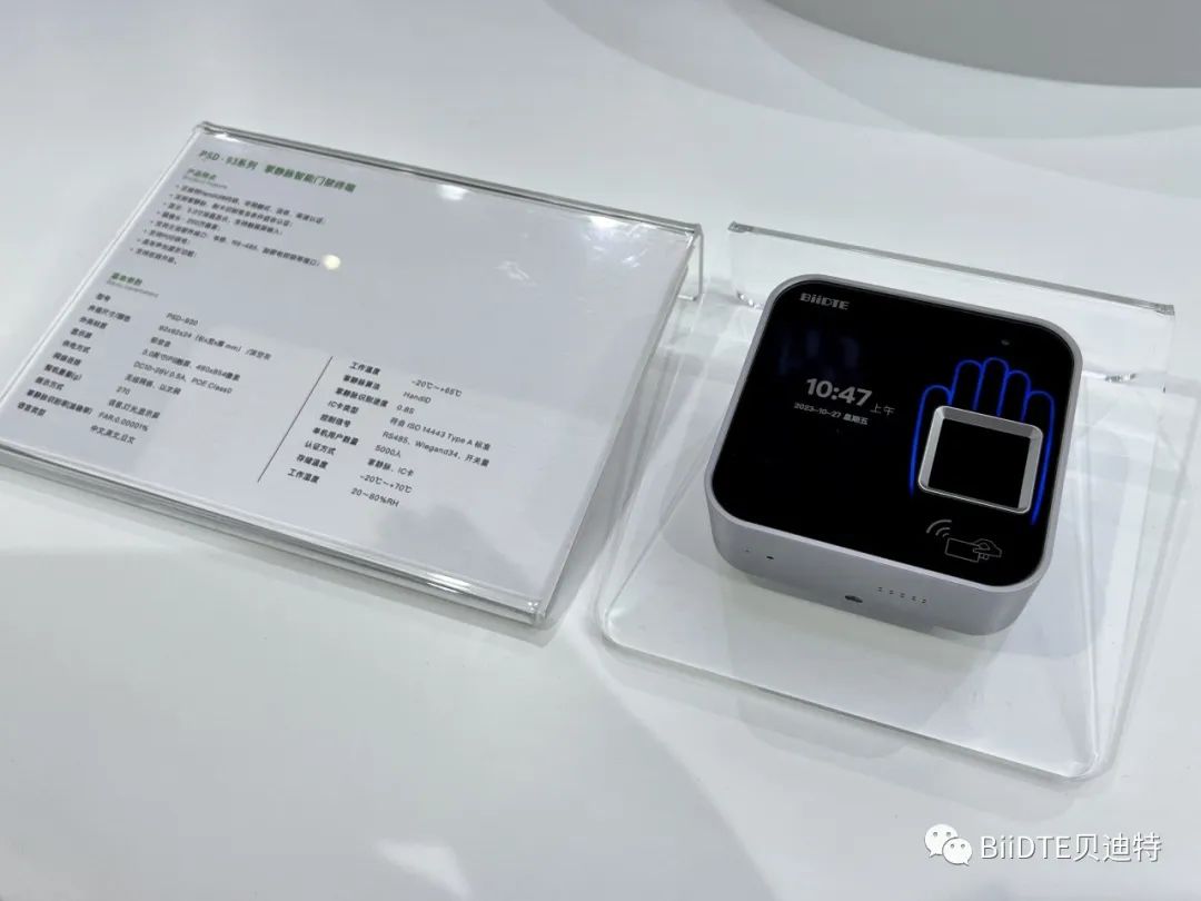 同时,在本次展会中,贝迪特重点展示最新上市的掌静脉识别产品,搭载最新HandID算法的多因子生物识别终端MF97。可同时支持掌静脉识别、人脸识别及IC卡三种识别方式,支持在线、离线认证模式,可实现0.7秒快速认证。质感的机身加新颖的识别方式在展会现场吸引了行业内外众多企业和专家争相参观、体验。